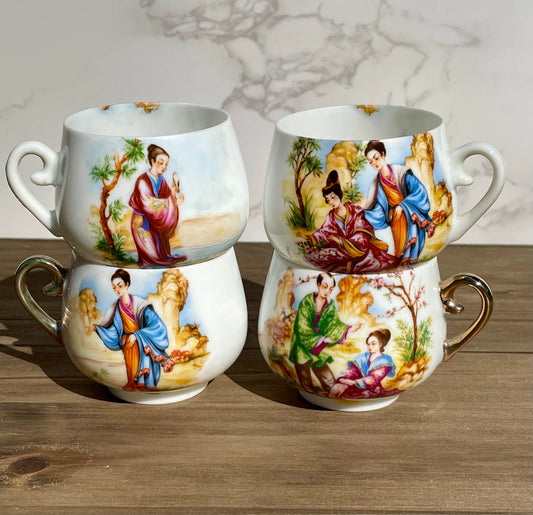 Antique Japanese Lithophane Geisha Motif Hand Painted Kutani Porcelain Tea Set of 4