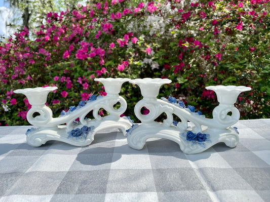 Antique Gerold Porzellan Bavarian White Glazed Porcelain Double Candlestick Holder Set with Tiny Blue Flowers