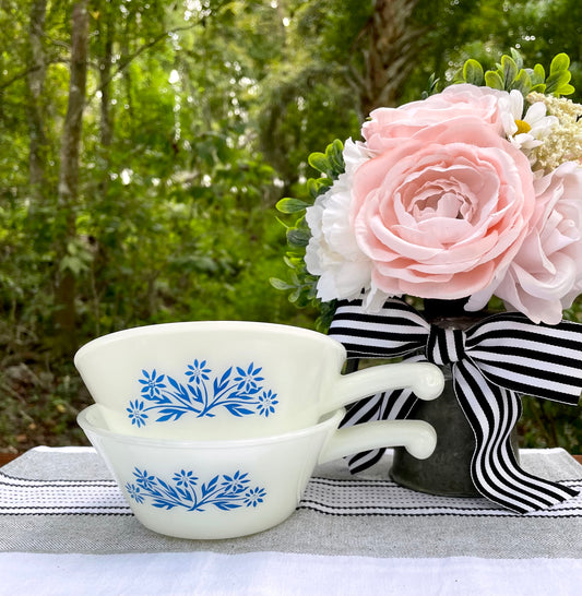 Antique Fire King by Anchor Hocking White Milk Glass and Blue Corn Flower Soup Bowls with Handles