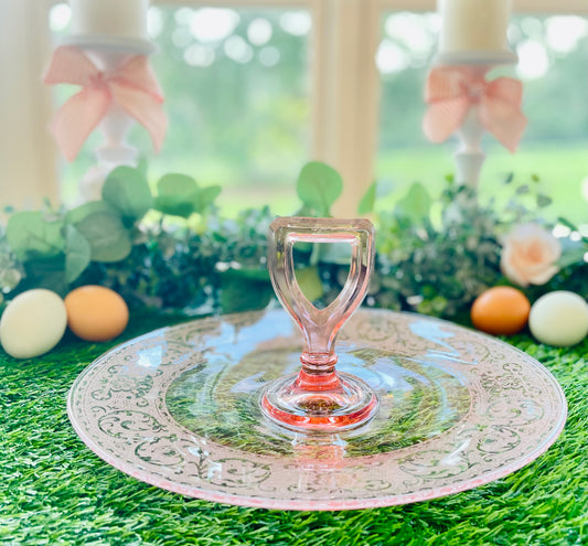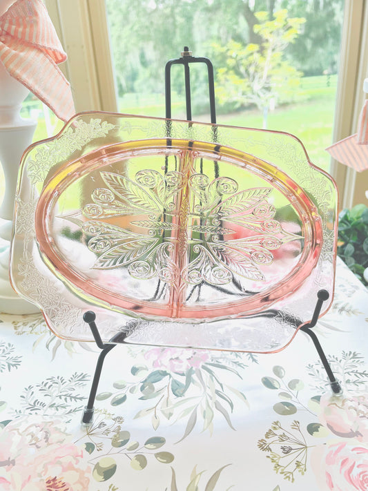 Antique Rare Pink Depression Glass Pearl Etched Octagon Shaped Serving Platter with Handles