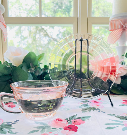 Antique Pink Depression Glass Square Optic Tea Cup and Saucer Set