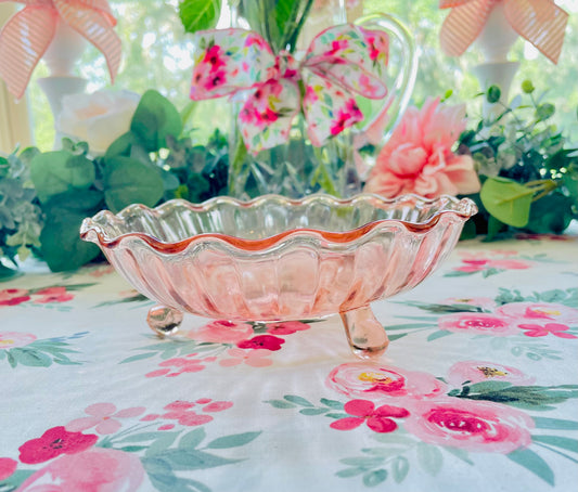 Antique Pink Depression Glass 1930s Scalloped Rim Three Point Footed Art Deco Bowl