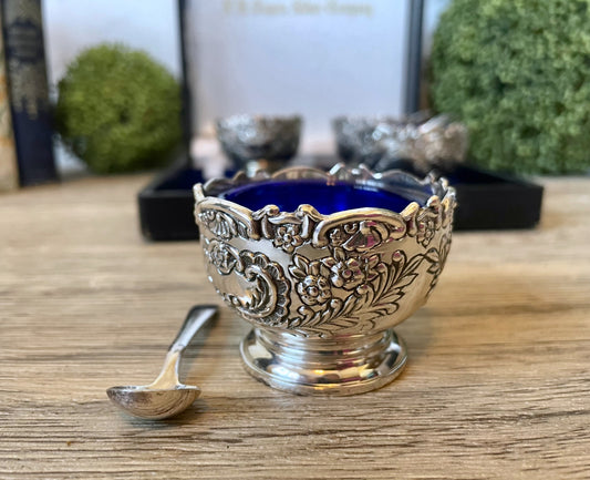 F. B. Rogers Silver Company Salt Cellars with Cobalt Blue Glass Inserts and Spoons
