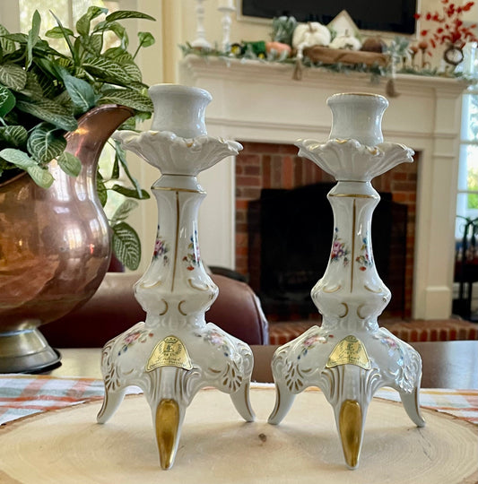 Lindner Kueps Bavarian Sanssouci weiß White Porcelain Candelabra with Pink Flowers and Gold Accents