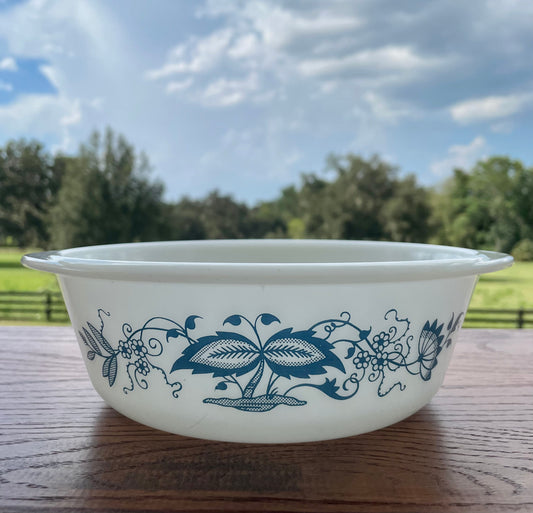Vintage Glasbake Blue Onion Flower 1.5 QT White Milk Glass Baking Dish Cottage Chic Bakeware