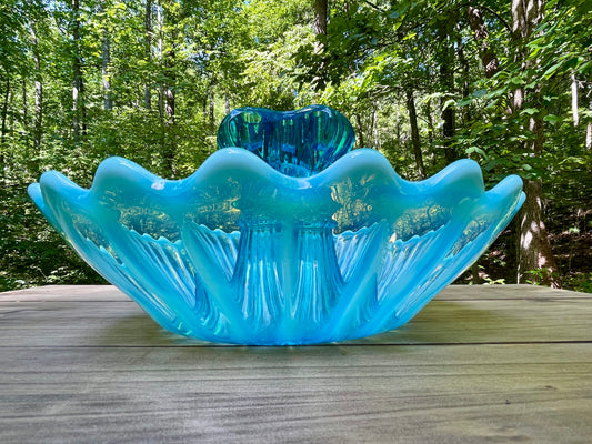 Vintage Blue Opalescent Pearline Glass Candle Centerpiece Bowl – Scalloped Elegance with 3-Taper Holder