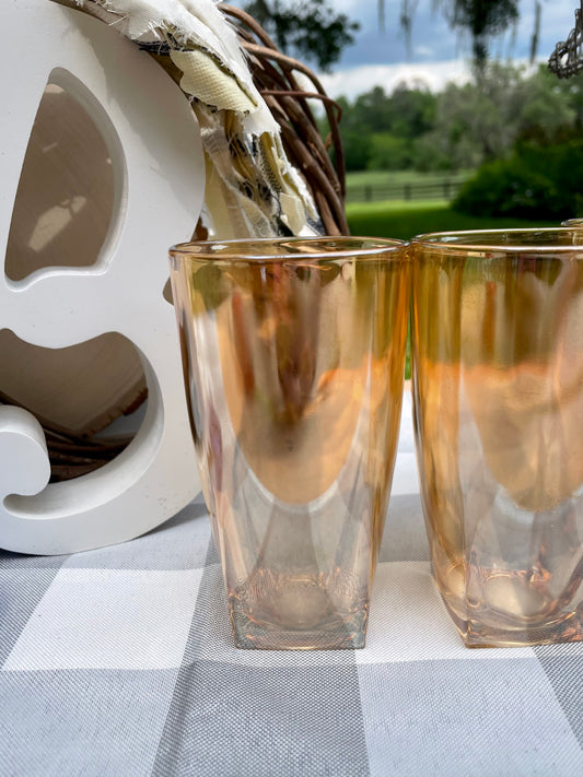 Vintage Marigold Iridescent Peach Lusterware Carnival Glass Square Based 16oz. Tumbler set of 3