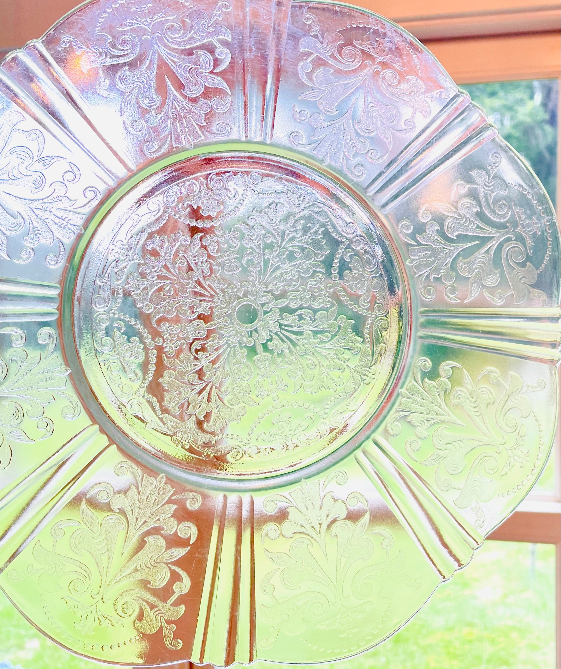 Antique Macbeth Evans pink depression glass American Sweetheart scalloped embossed with filigree designs on each part of the plate. The center is embossed with a beautiful art nouveau design.