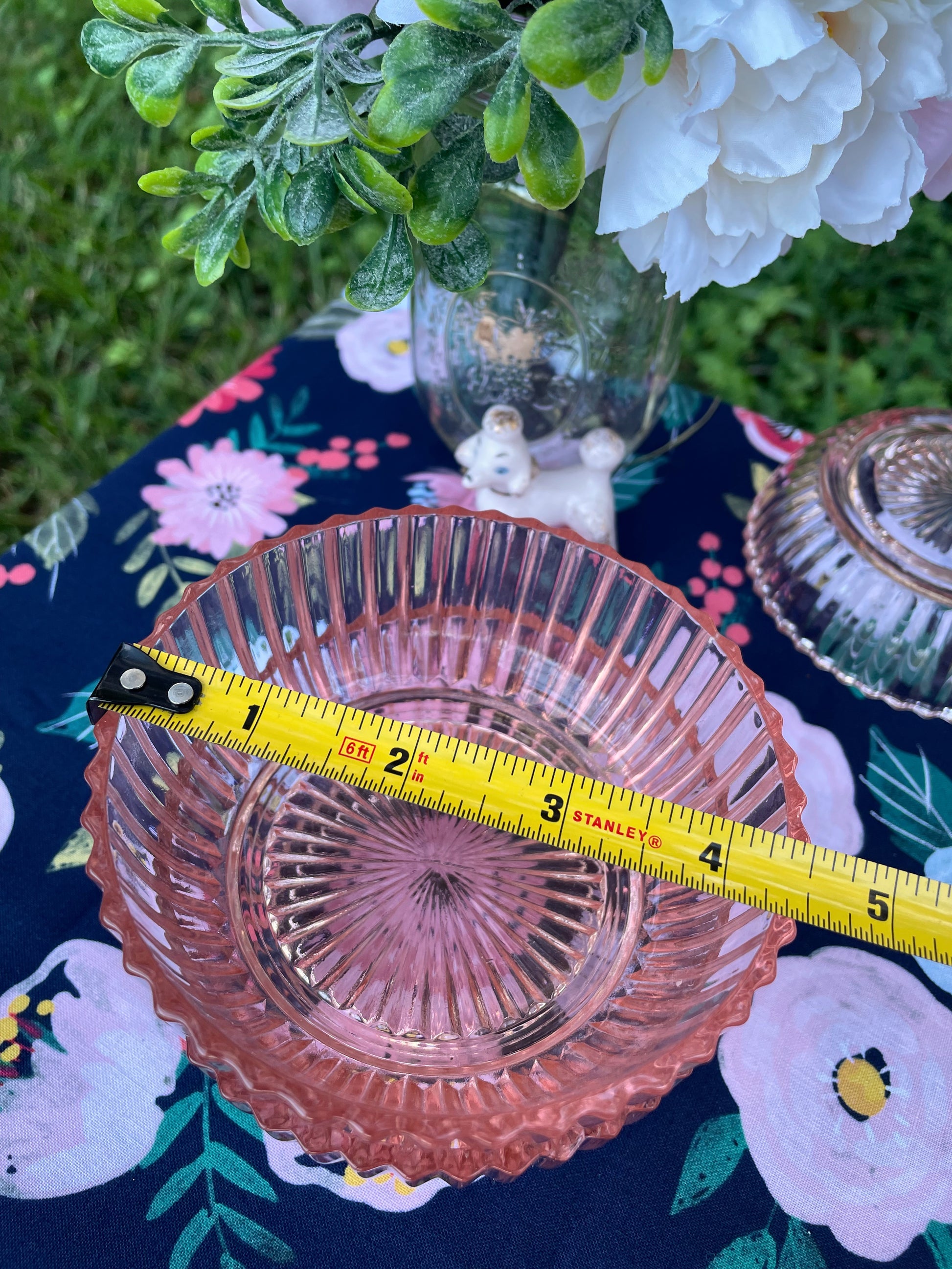 Antique Anchor Hocking Queen Mary pink depression glass small bowls set of 3 with 2 matching nappies. Beautiful dainty ornate paneled bowls and cups with sunburst designed bottoms. These bowls and nappies were made by Hocking Glass Company from 1936 to 1949.