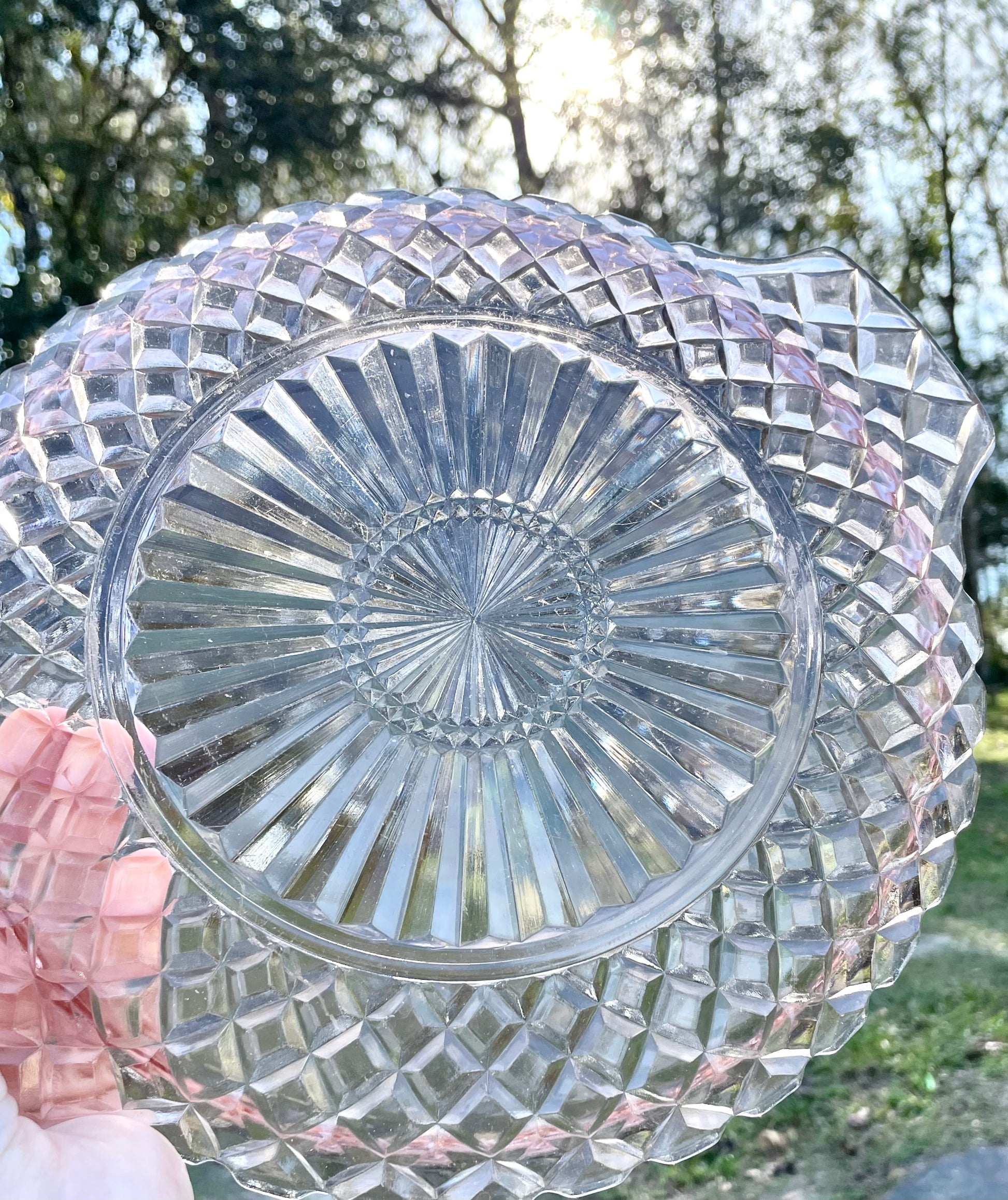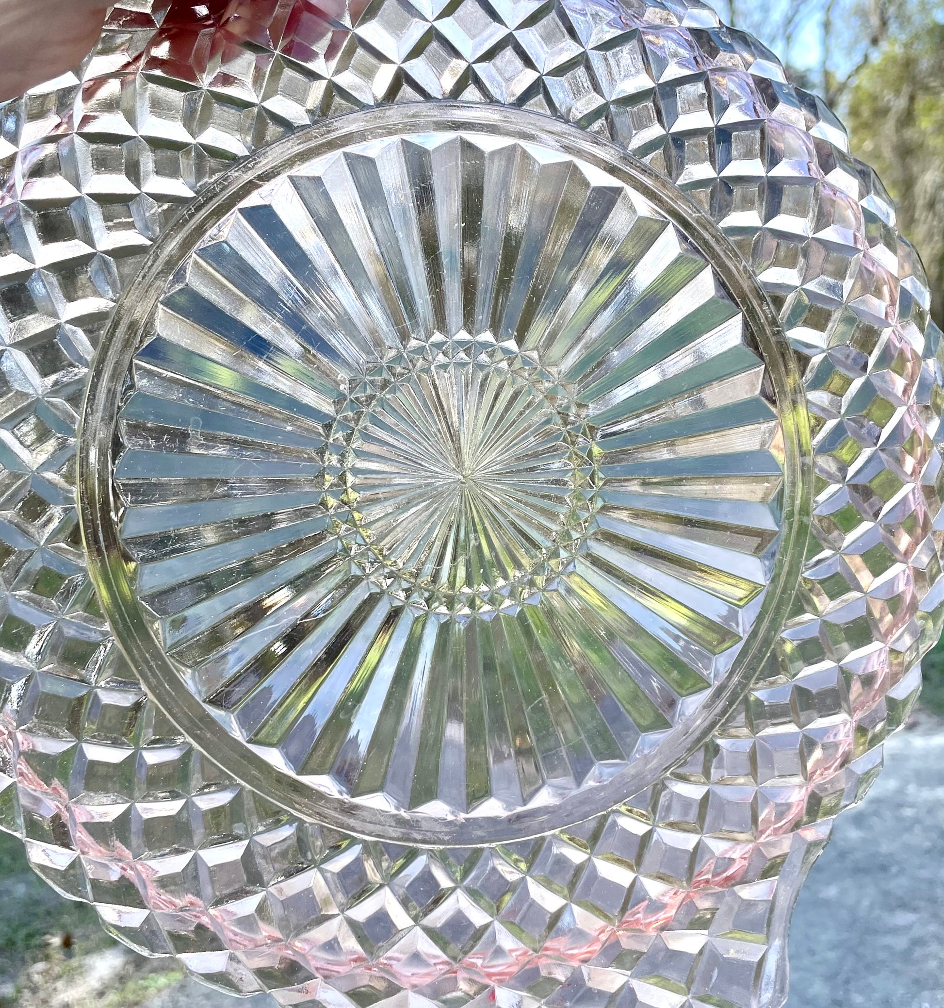 Gorgeous antique pink depression glass diamond pattern with a sunburst designed center serving platter with carrying handles.