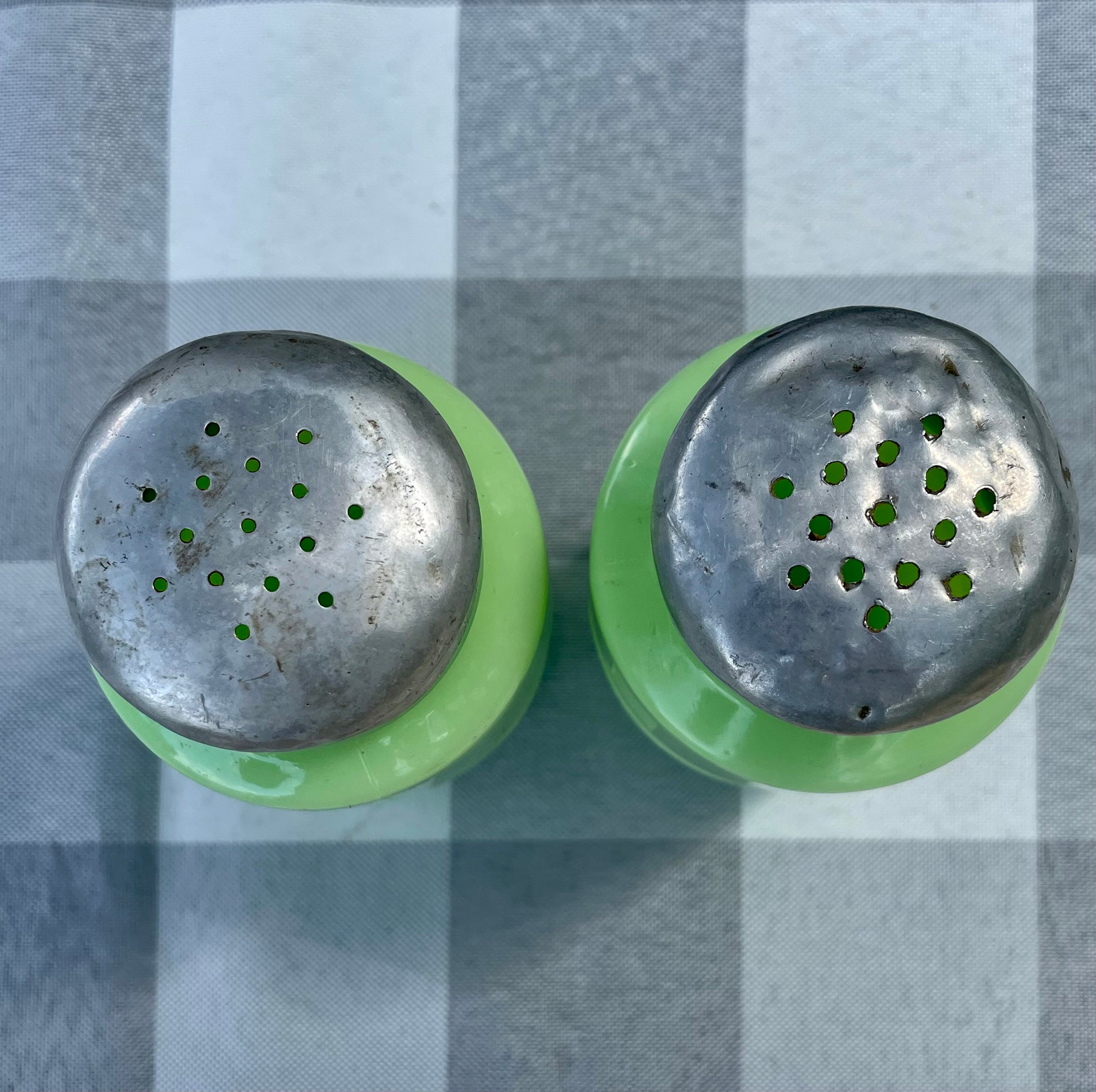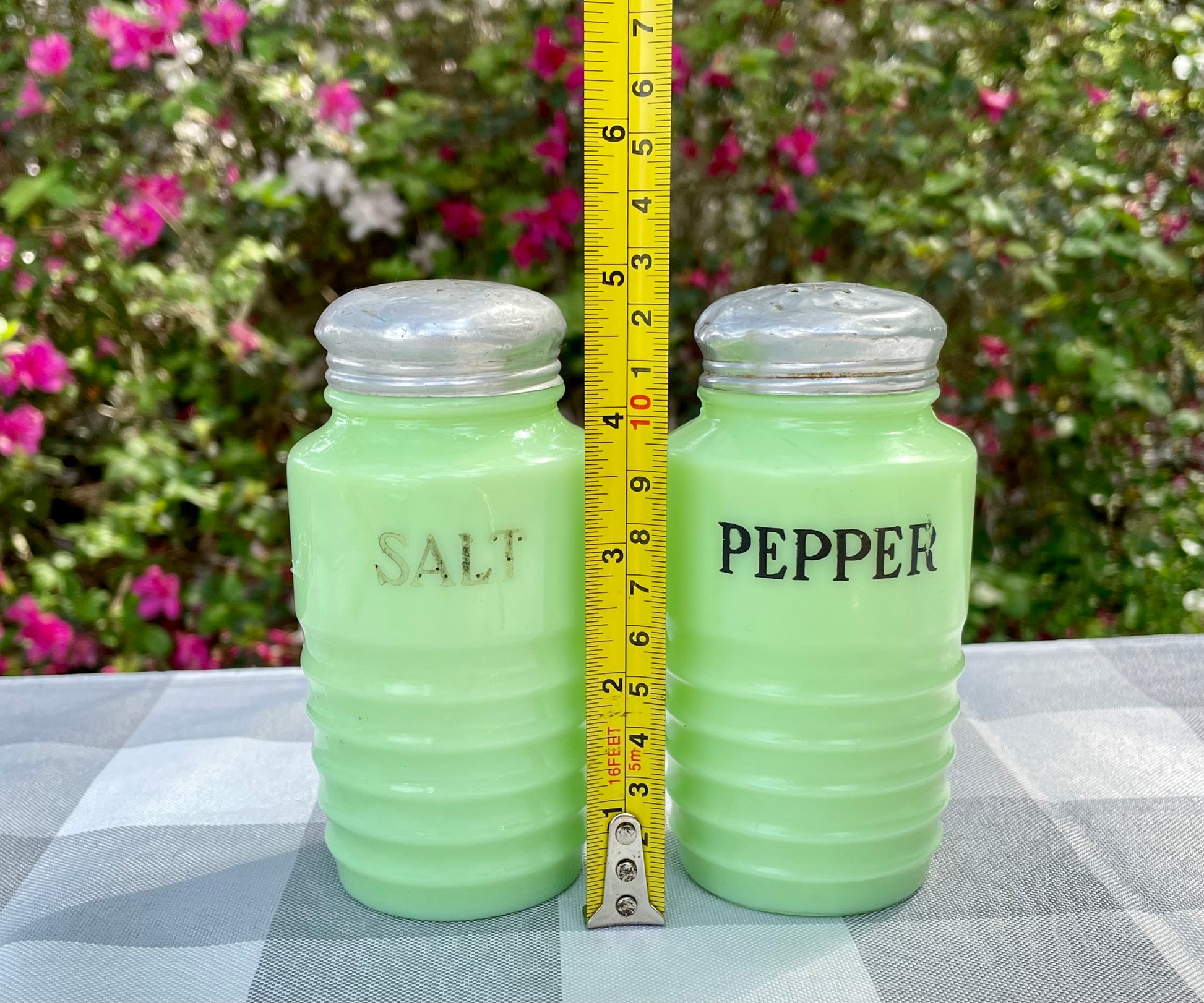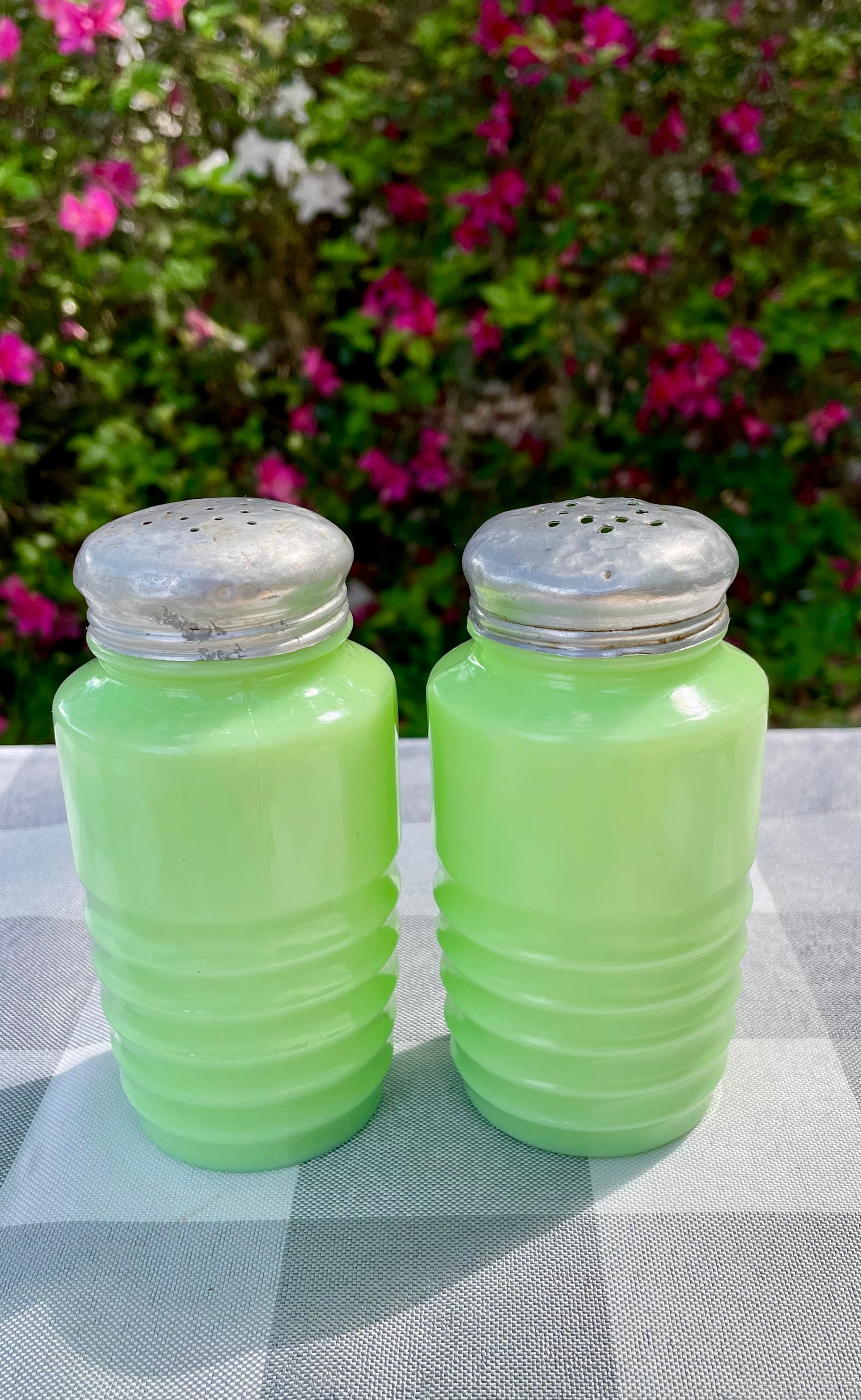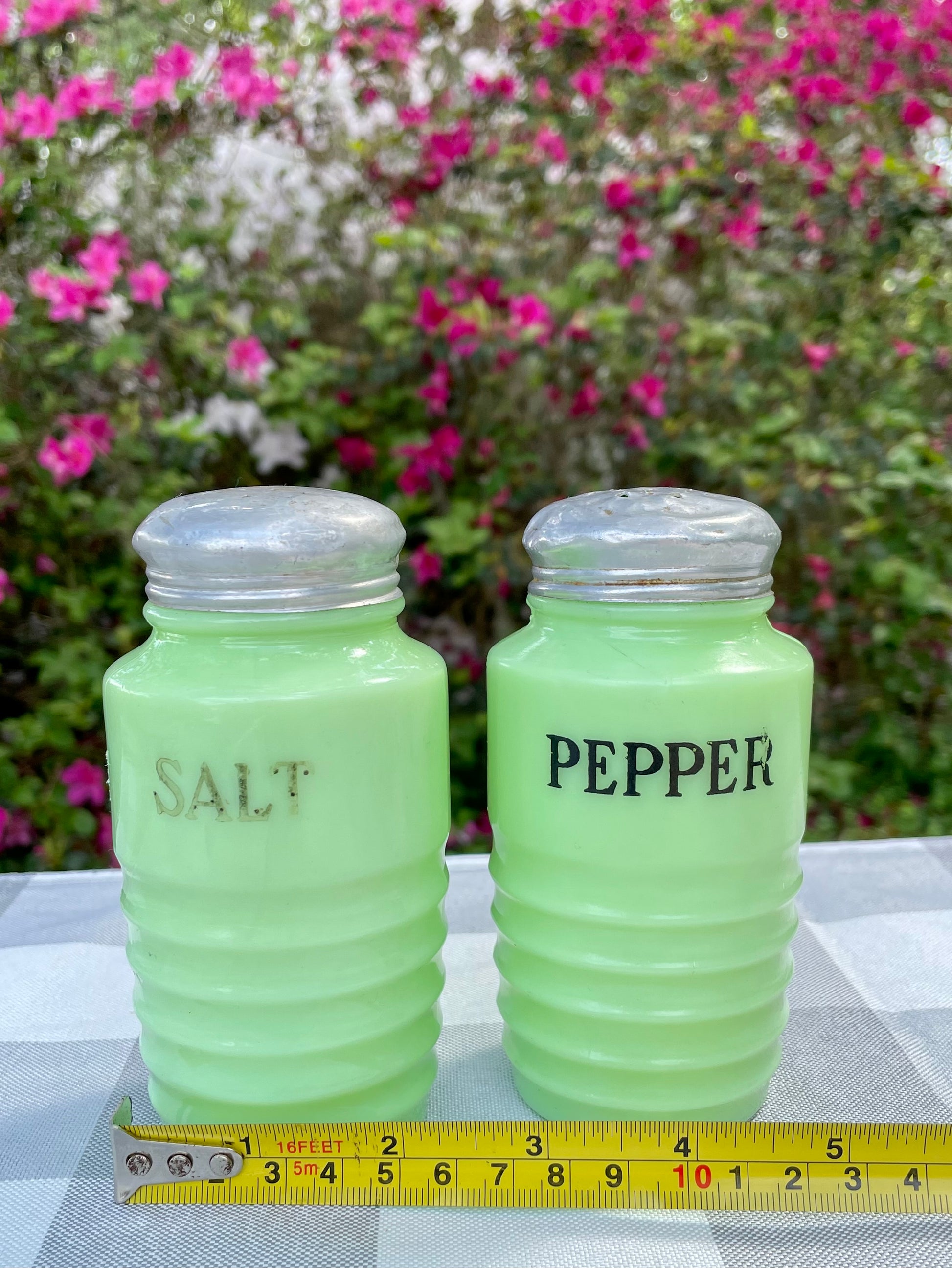 Vintage 1930s Mckee Beehive Uranium Milk Glass Jadeite Green Salt & Pepper Shakers