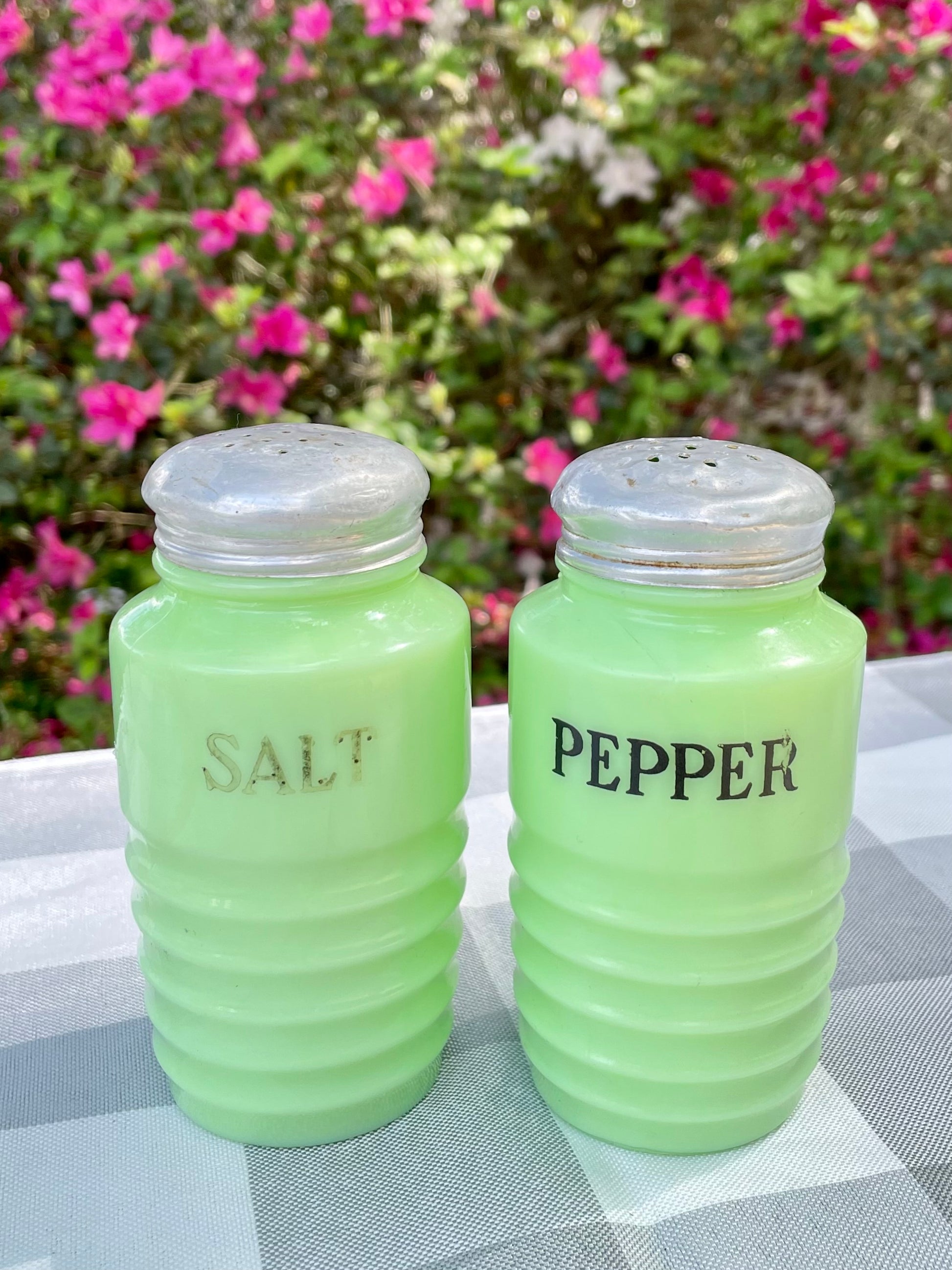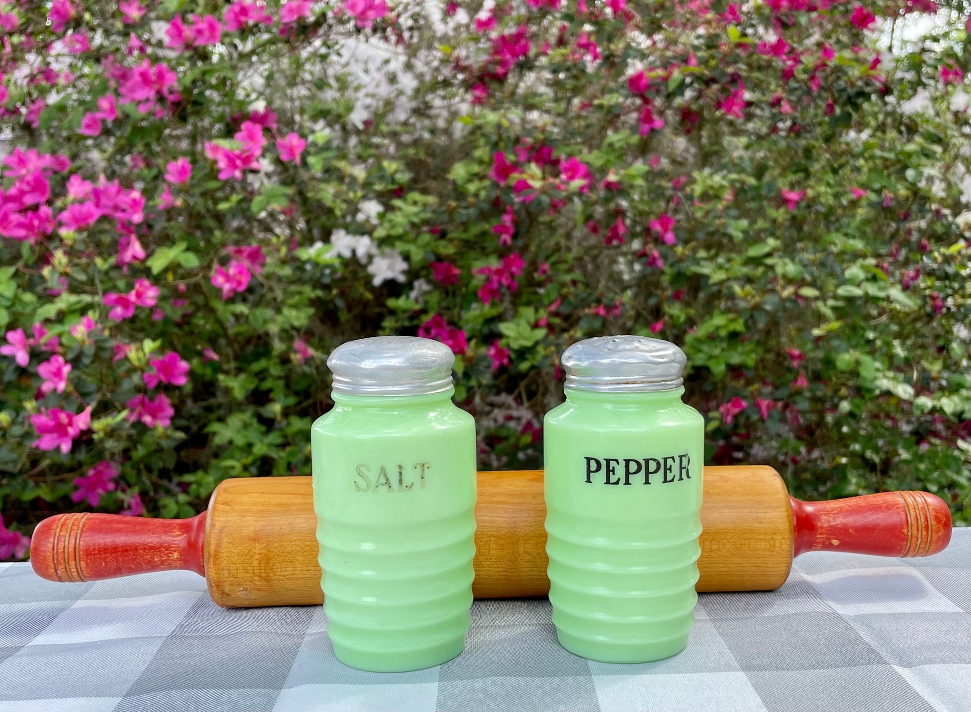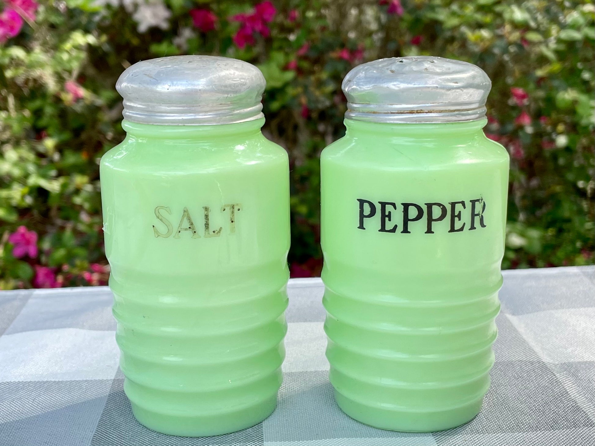 Vintage 1930s Mckee Beehive Uranium Milk Glass Jadeite Green Salt & Pepper Shakers