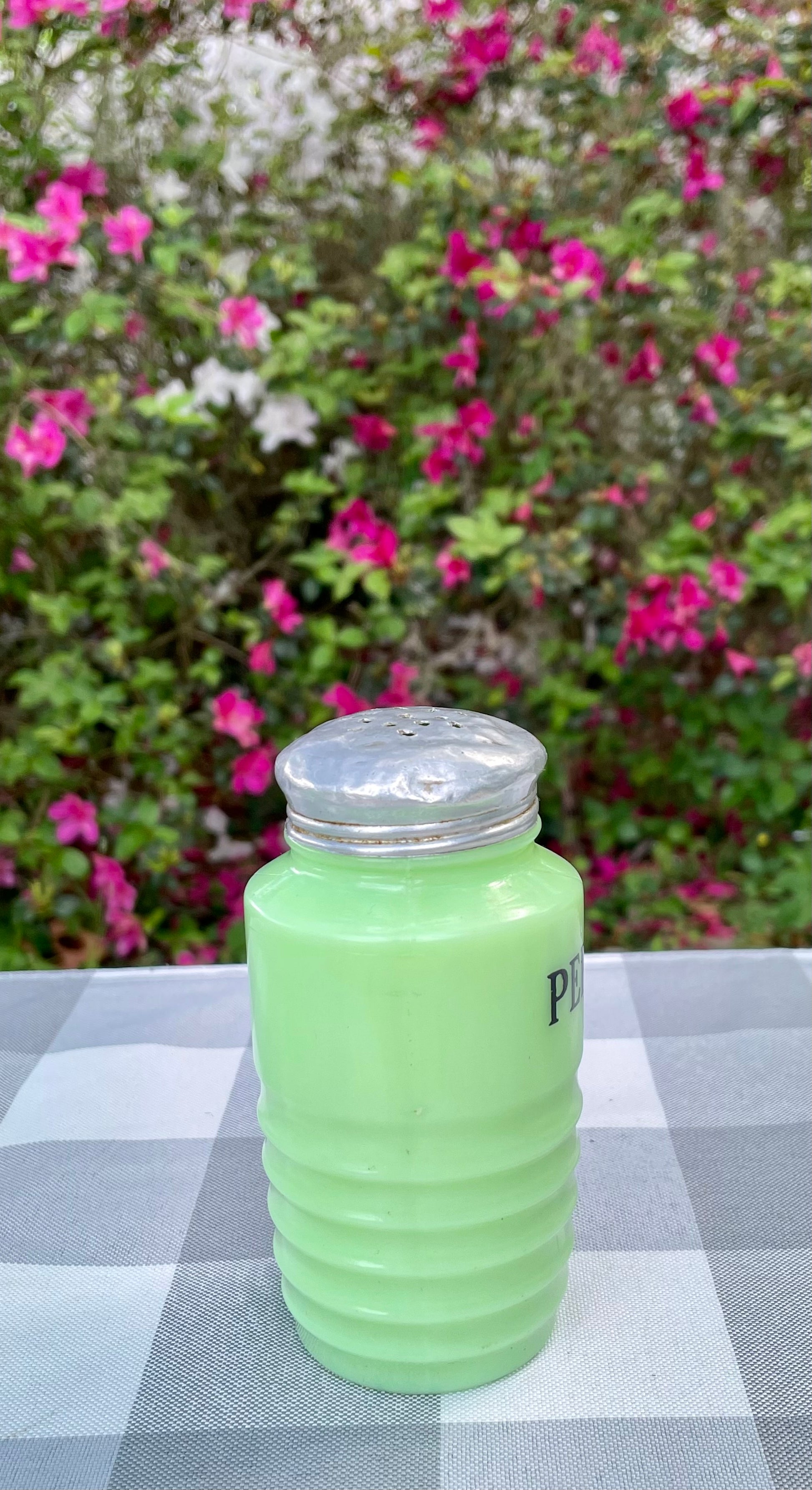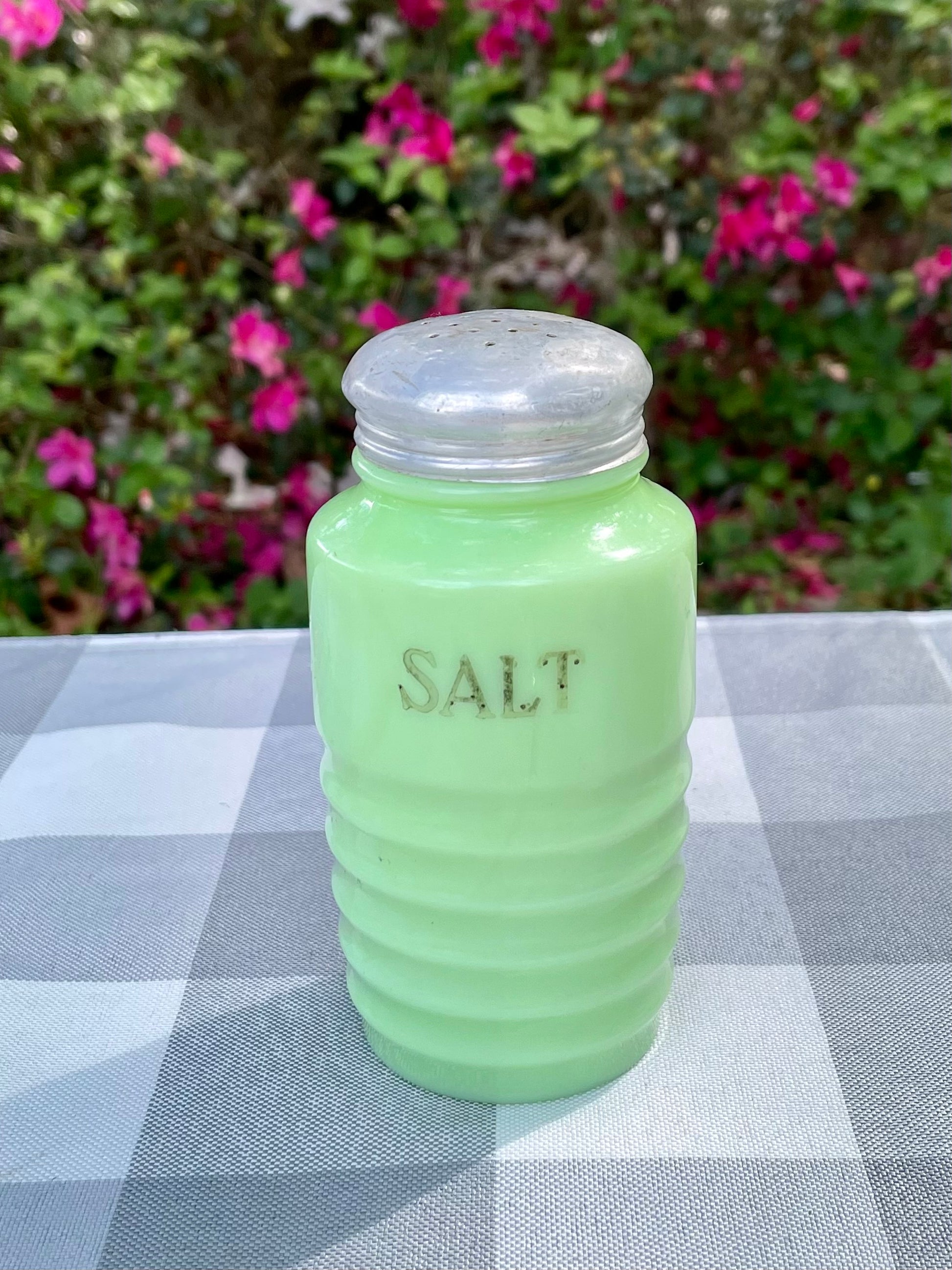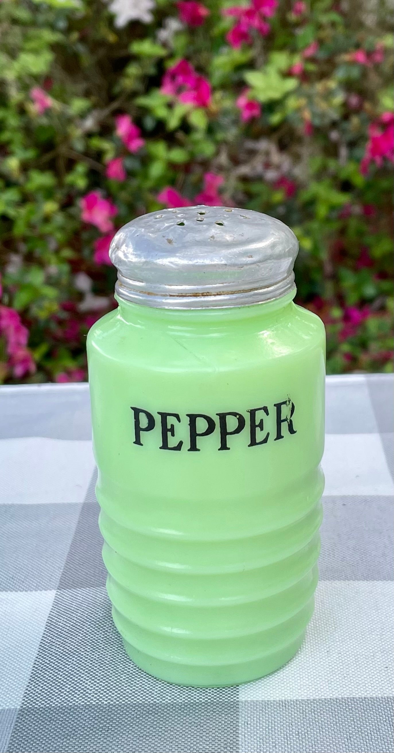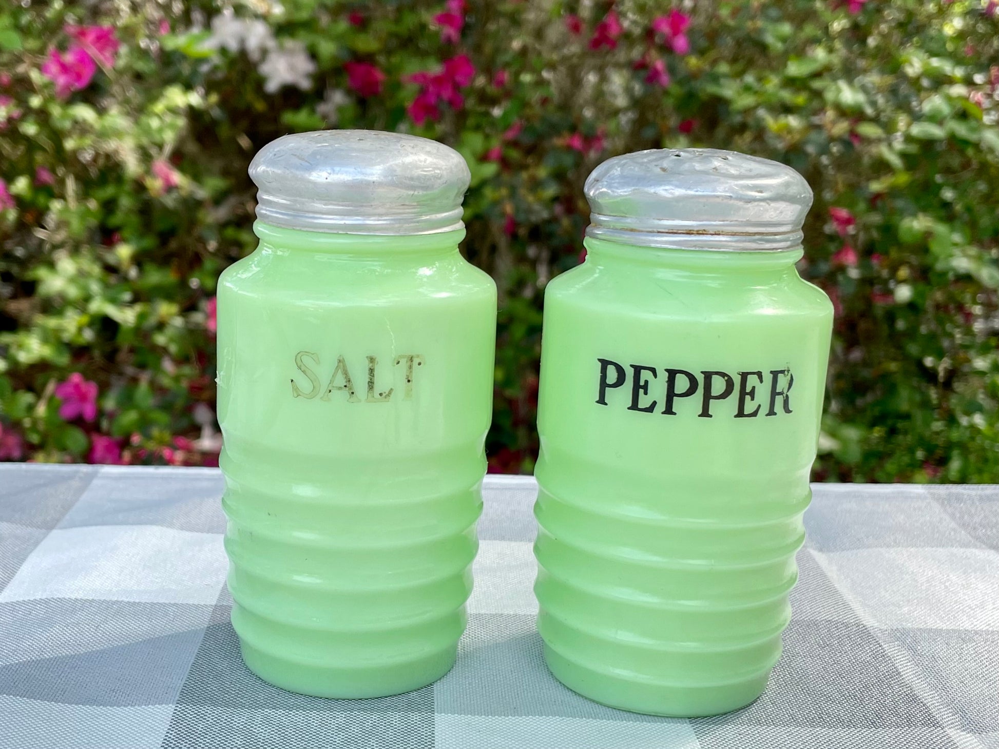 Vintage 1930s Mckee Beehive Uranium Milk Glass Jadeite Green Salt & Pepper Shakers