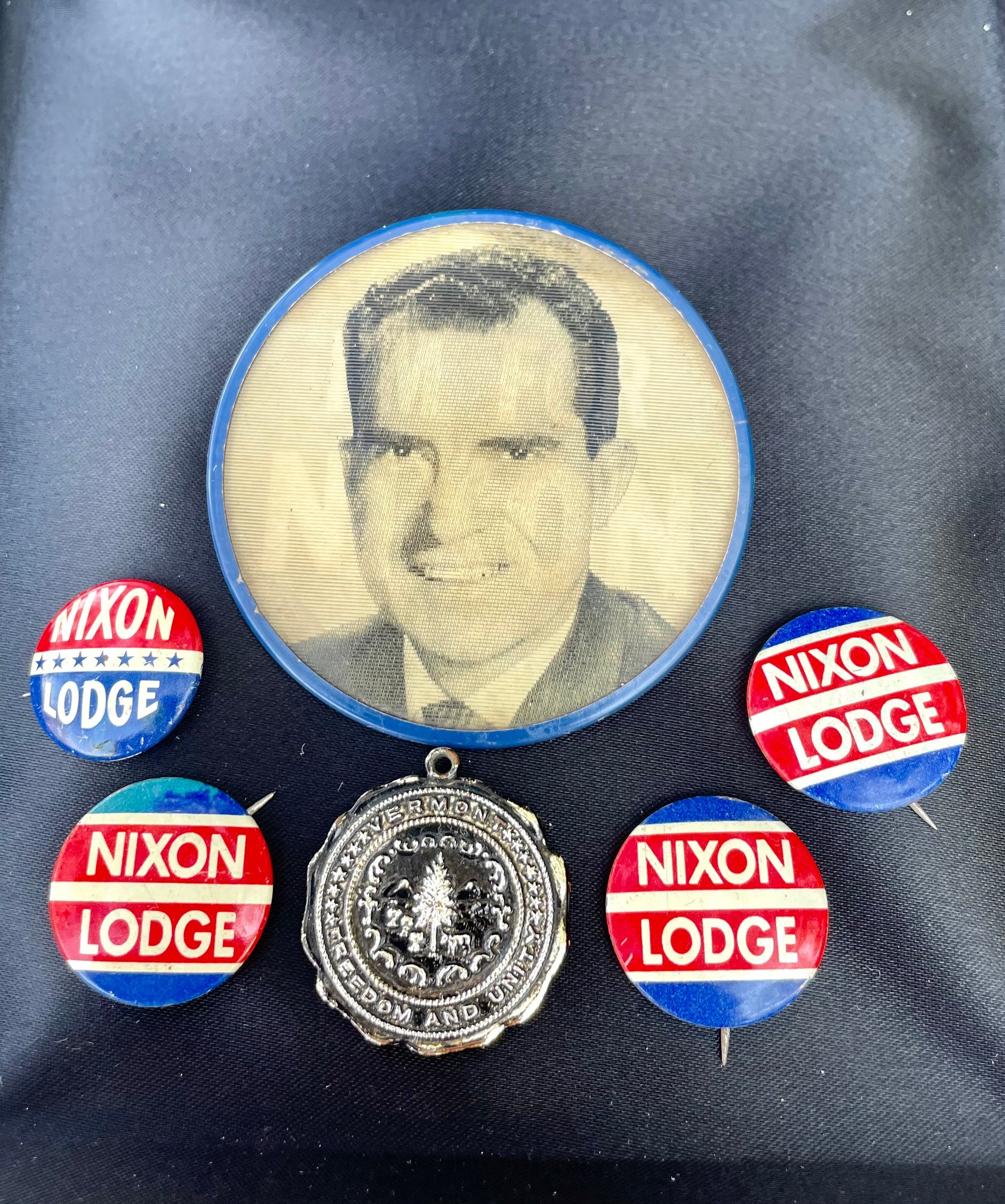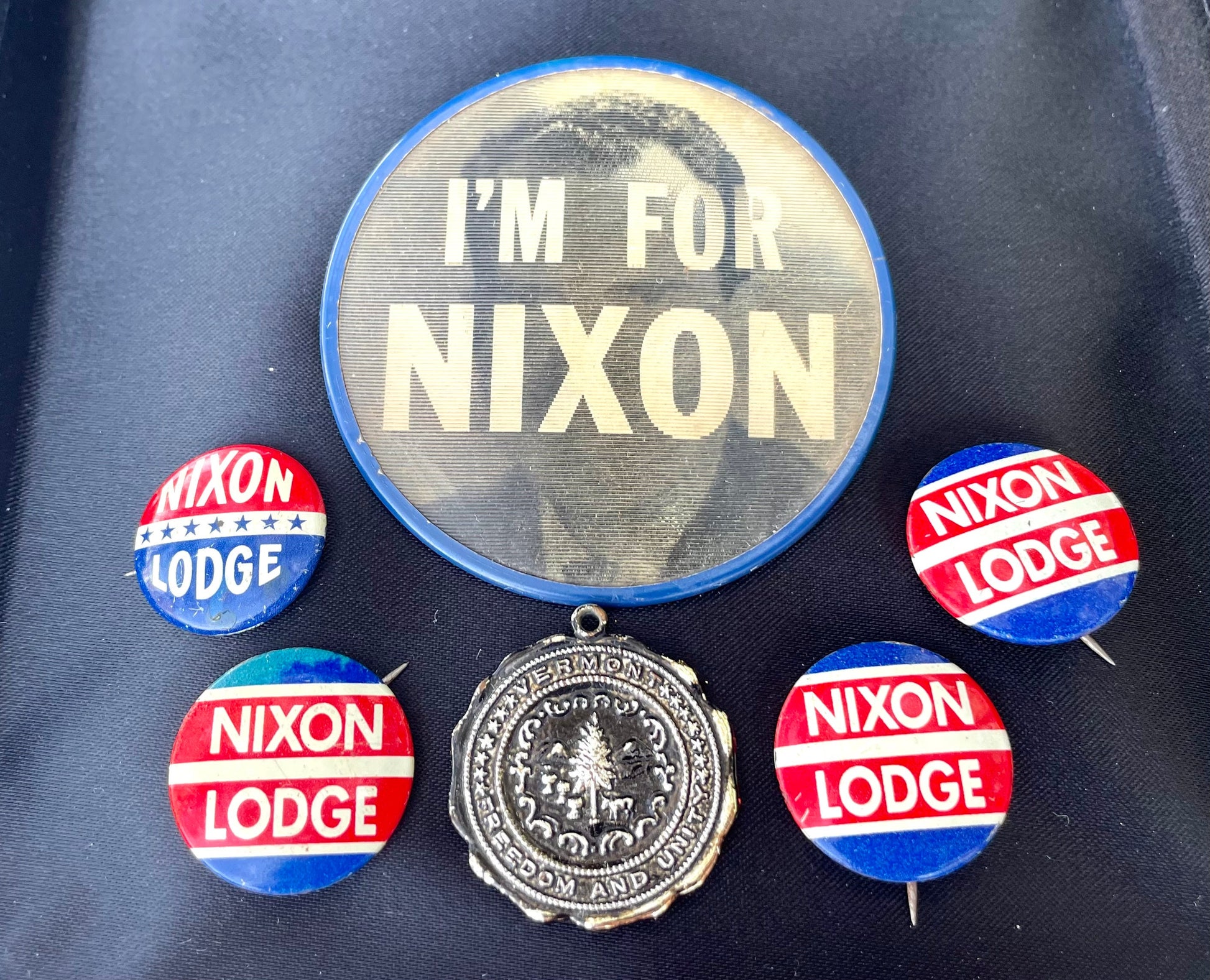 Vintage small red, white & blue 1960s United States presidential campaign of Richard Nixon and would be Vice President Henry Cabot Lodge. Blue round metal pin with large red stripes & small white stripes and white writing.