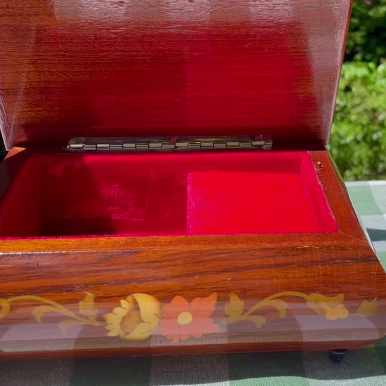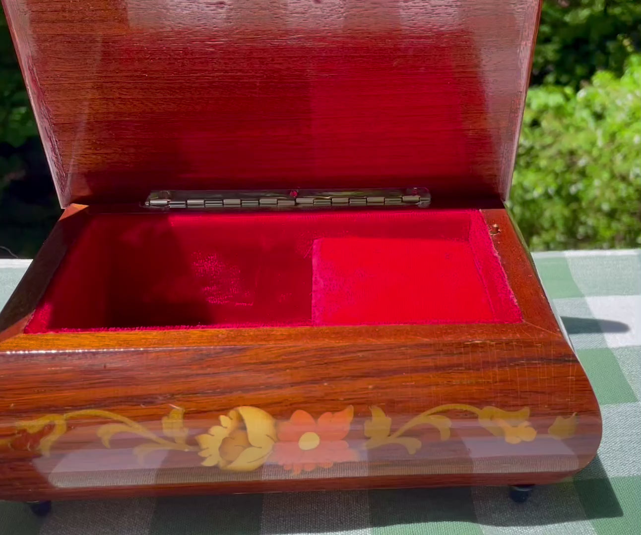 Slip away in a whisper of timeless romance with this exquisite vintage Reuge Swiss music jewelry box. A symphony of craftsmanship that transports you to sun-drenched Italian hillsides and the golden age of melodic elegance. Handcrafted in Sorrento, Italy, with a lustrous rosewood exterior adorned in breathtaking floral marquetry, each petal and vine inlaid by skilled artisans using vibrant woods that dance in hues of gold, cream, and verdant green. Open the gently curved lid to reveal a flawless crimson velvet interior, cradling your most cherished jewels like a secret garden of treasures. As the lid lifts, the precision Swiss Reuge movement awakens, filling the air with the hauntingly beautiful strains of "L'amour est bleu" (Love is Blue) the iconic 1960s melody that evokes endless summer evenings and heartfelt whispers. This heirloom piece stands poised on elegant feet, its glossy finish gleaming. In pristine condition, with every note crystal-clear and every detail untouched by time, this isn't just a music box—it's a portal to pure enchantment, a must-have for the collector who craves the irreplaceable magic of yesteryear. Don't let this rare gem slip away; make it the centerpiece of your vanity or the gift that steals hearts forever.